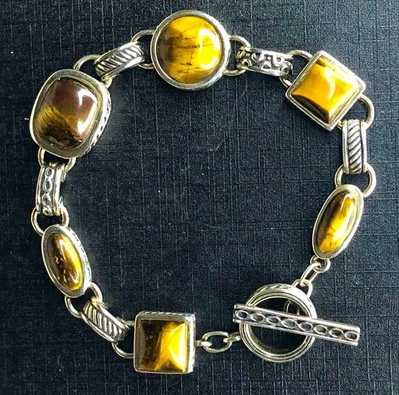 BARSE Sterling Silver Toggle Bracelet Alternative Cabochon Links of Tigers Eye and Cats Eye Each Gem Stone Is Set In Alternating Sterling Silver Links Of Round Sterling Accents or Rope Design Vintage BARSE Design and Bracelet Condition: Excellent Condition BARSE Has Gone Through Different Periods or Styles over the Decades. This is An Earlier Piece That Was Made of Sterling Silver and In Thailand. It Has More Movement and Components Than That of Her More Modern Pieces. The Supporting Links Between Elements Also Bare The Same Design Treatment The Main Cabochon Pieces Do. A Piece For A Collector Of BARSE or Someone Whom Appreciates Well Constructed Jewelry Color May Vary Based on Shadows, Lighting, Monitor, Display Settings Ask Questions and/or Request Additional Photos, Measurements as Needed Photos of Measurements Are Available in The Slides