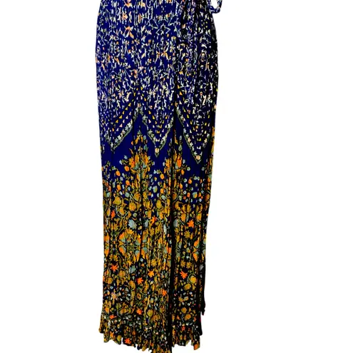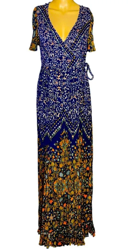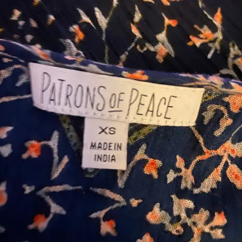 Patrons of Peace maxi dress in size extra small is a true bohemian gem. The dress features a stunning navy blue background with a vibrant floral and geometric pattern in shades of orange, yellow, and white. It has a flattering wrap design with a V-neckline and short sleeves. The dress is made from 100% rayon, providing a lightweight and comfortable feel. Perfect for a summer day, a festival, or a casual night out. Made in India. Style # FW 1214. • Condition loos brand new no tags • Measurements Length 56” Bust 4” Waist 13”
