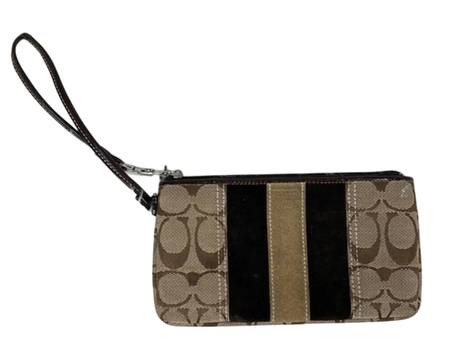 Coach signature monogram canvas Brown and tan colorway with suede and metallic stripe detailing Wris... Show more