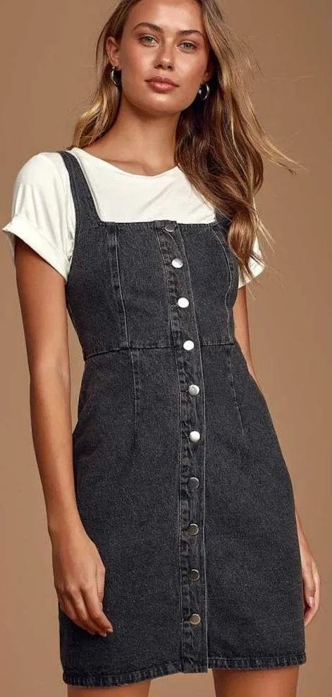 overall dress, jumper dress, mini dress, pinafore dress, Square neck, square neckline, Button front, button-up, adjustable straps, sleeveless, pockets, Denim, jean, cotton, Washed black, charcoal, dark gray, black denim, Fitted,Casual, preppy, retro, 90s, Y2K, Everyday, casual wear, weekend, school, college, Stretch denim, sleeveless, short dress