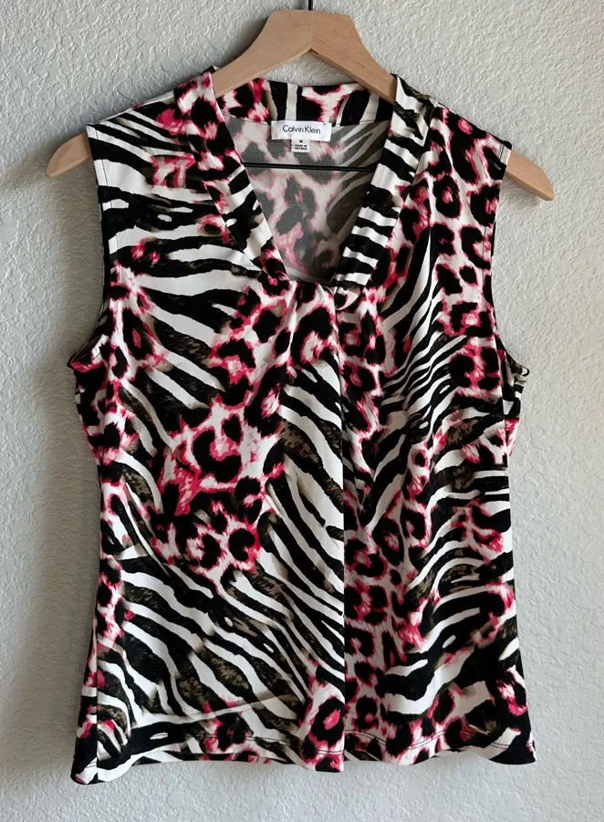 Bold and chic, this Calvin Klein blouse features a striking mix of zebra and leopard prints in a sle... Show more