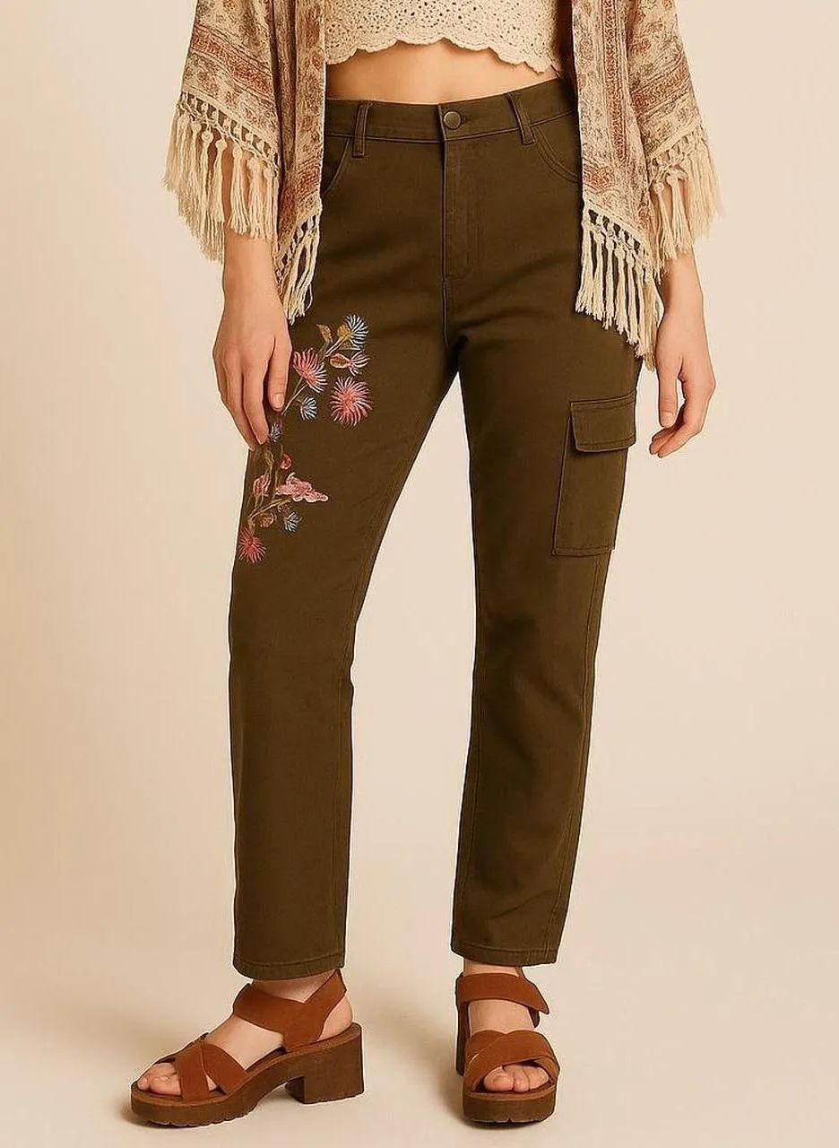 Y2K 2000s Matilda Jane Green floral embroidered cargo pants #floralpants Good condition Embroidered floral detailing stock photo shows a different size olive green, embroidered floral, cargo style, tapered fit, vintage-inspired, casual streetwear, floral applique, distressed detail, versatile, boho