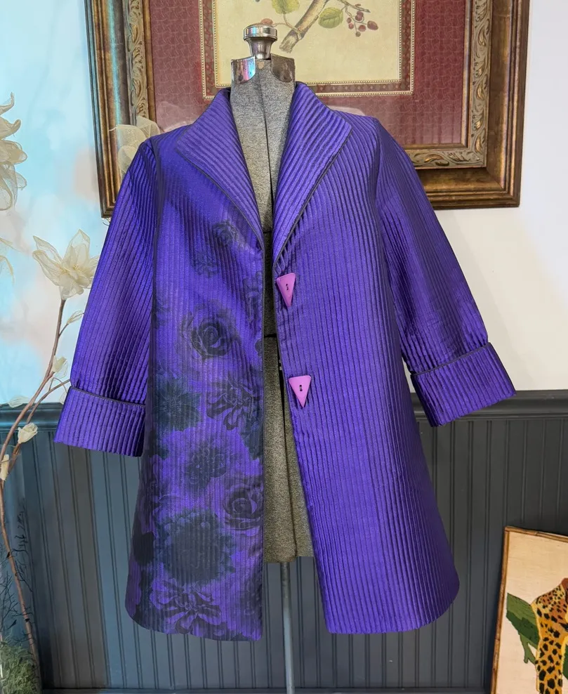 Stunning IC By Connie K metallic jacket in a vibrant metallic purple! Features an wide ribbed design bold black rose embroidery on one side. Notched lapels, cuffed sleeves, and oversized triangular buttons add chic flair. Perfect for layering over a dress or trousers. Measurements are approximate and from laying flat: Chest: 21” Length: 32” Avant garde ~ floral ~ metallic ~ art to wear ~ funky ~ ribbed ~ unique ~ statement ~ modern ~ business ~ business casual ~ layering
