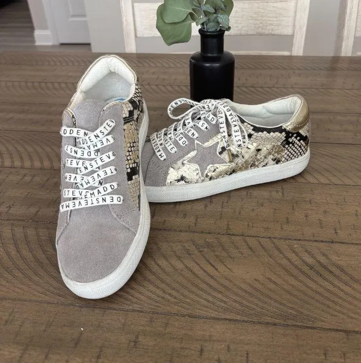 Stylish Steve Madden sneakers with snake print. Features gray and cream tones. Perfect for casual we... Show more