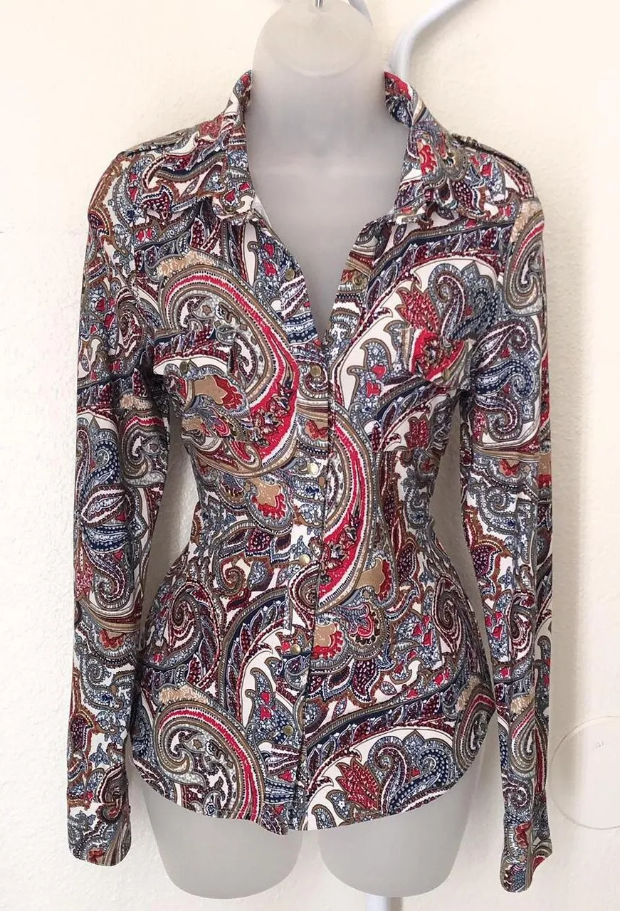 BCBG Blue, red, white paisley long sleeve button up down fitted shirt blouse top long sleeve office... Show more