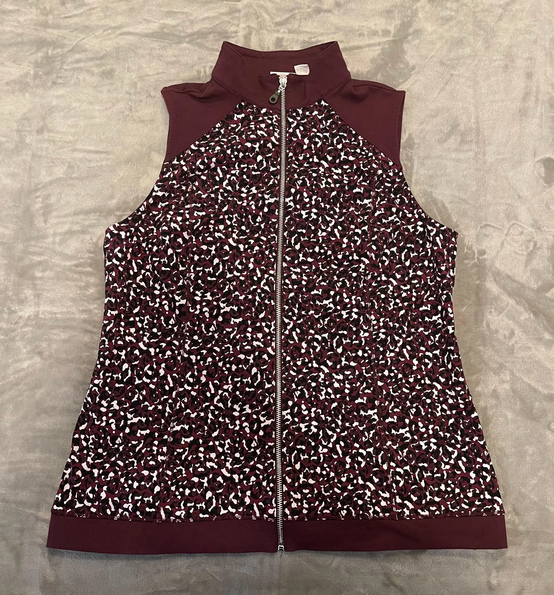 Weekends by Chico’s Maroon Printed Zip Up Vest -maroon, black, and cream printed vest -zip up -86%... Show more