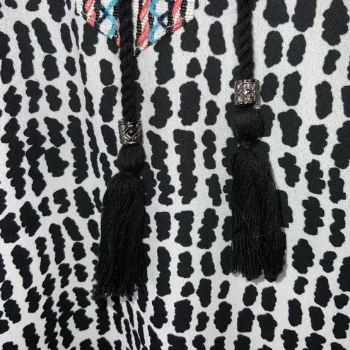 Like New Stitch Fix Daniel Rainn Black & White Short Sleeve Tie Front Casual Blouse Blue and orange embroidered Neckline Tie with tassels Hi/Lo hemline 100% polyester Hand wash Medium Approx measurements laying flat 19” armpit to armpit 25”-30” shoulder to hem