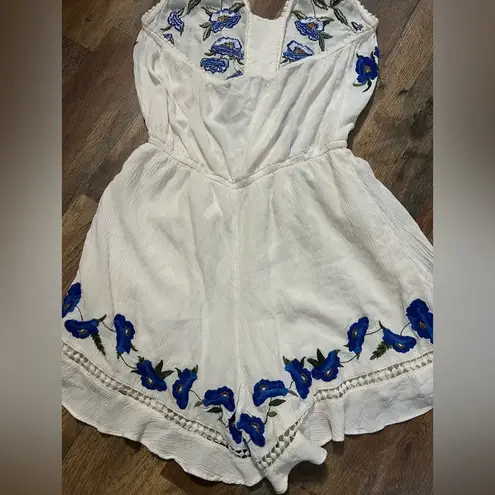Fun summer white jumpsuit romper with blue embroidered flowers. Halter tie top. Elastic waist and ba... Show more