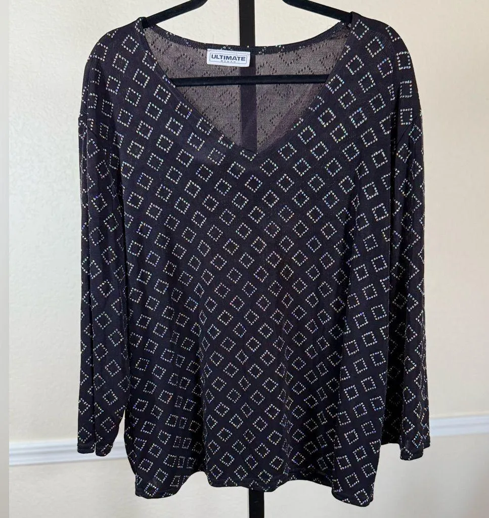 Brand: Ultimate Size: 2X Color: Black with holographic metallic diamond print Material: 95% Polyester / 5% Spandex • Sheer lightweight metallic holographic fabric • Stretch v neck cut, long sleeves • Festival or night out ready Approx. Measurements Pit to Pit: 24” relaxed, 27” stretched Full Length: 28” Preowned. In excellent condition. Clean, no flaws. Packaged with care. Ships same or next day. ladybugthreads G4WBZ