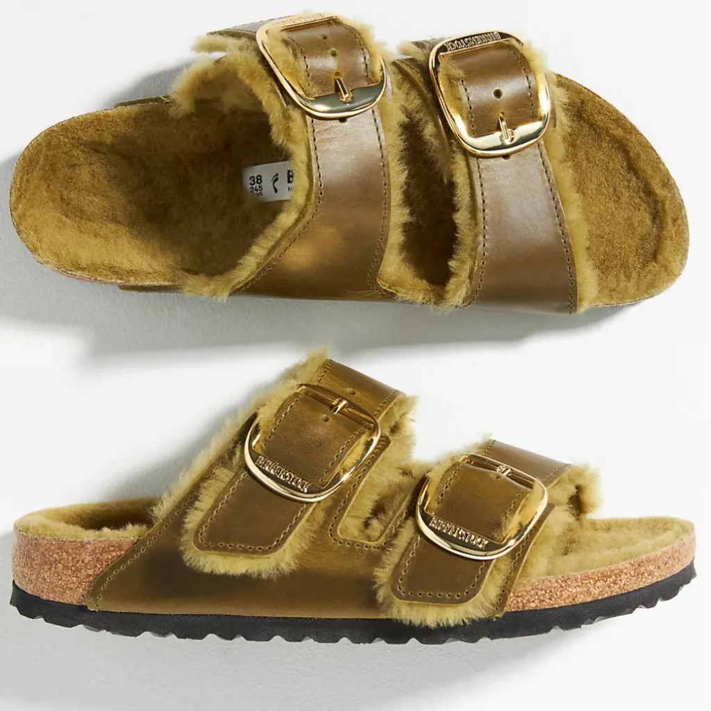 Birkenstock green olive shearling Arizona sandals. Genuine oiled leather upper; furry shearling line... Show more