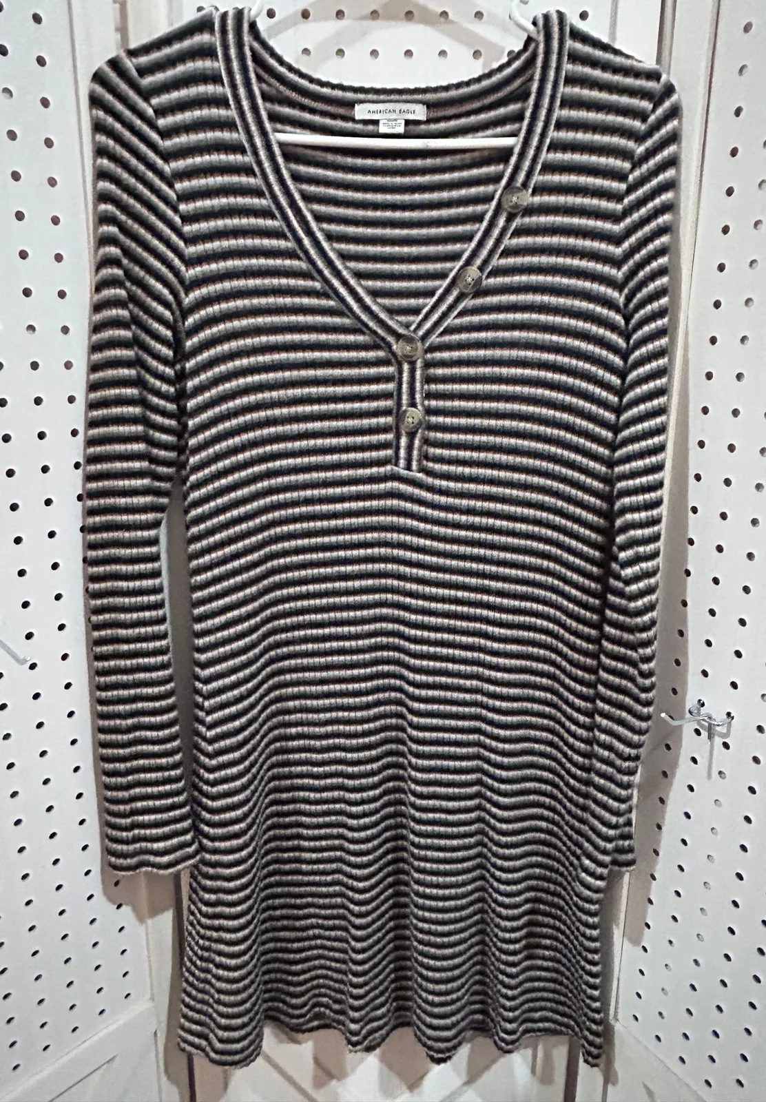American Eagle Outfitters long sleeve ribbed knit dress in a multi-stripe pattern. Features a flatte... Show more