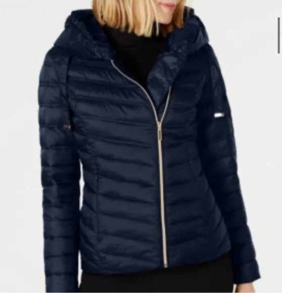 Laundry by Shelli Segal Asymmetrical Hooded Packable Puffer Coat in Petrol. • Size XSmall •In excell... Show more