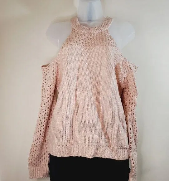 Poof Pink Knit Long Sleeve Cold Shoulder Mesh Sweater S small It's a pink muted color Cut outs on t... Show more