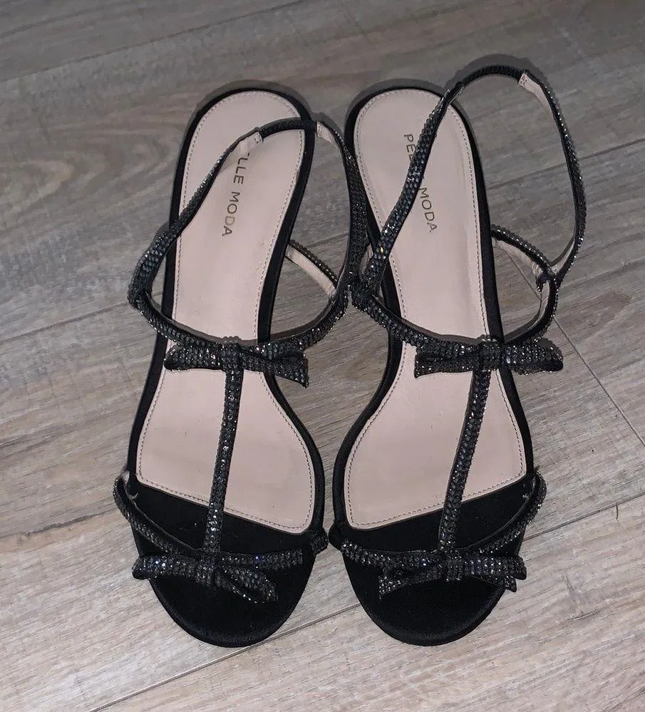 Pelle Moda Black Sequined Strappy Heels Sandals Bow Wedding Formal Size 9 Pelle Moda's black sandals... Show more