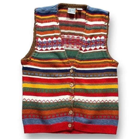 90s Original Russ Sport Company Knit Vest Vintage Size Small Rustic sleeveless sweater Harvest shades of sienna white brown red blue green and mustard yellow Geometrical horizontal stripes Vneck Wooden buttons Thread border gives a Western feel Made of a raimie cotton blend Flat Lay Measurements 19.5 inches pit to pit 25 inch length Thank you for shopping sustainably with this preloved item A colorful retro addition to your wardrobe Style with an earthy , natural, farm, woodsy, Southwestern ranch aesthetic