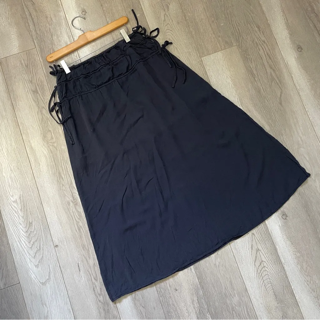 All Row Side Tie Skirt in the color Navy Blue. Elasticated tiered detailing with side ties along waistband, midi length. Lightweight, breathable fabric. Size small, womens. In great pre-worn condition, no major issues. 55% rayon, 45% spandex. Super cute minimalist, chic, cottagecore, coquette girl, basic, plain, capsule wardrobe, spring summer, casual effortless style. //B740, 8.5