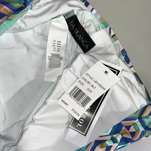 La Blanca Size 20W Geometric Print One Piece Bathing Suit. Surplice, V-Neckline. Lightly Padded Bust (Removable). Criss-Cross U-Neckline (Back). Body, Lining 1 & Lining 2 is Nylon/Elastane Blend. NWT, Brand New With Tags.