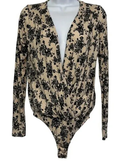 Women's Intimately Free People Tan Black Long Sleeve Bodysuit Floral Size Small EUC #2273