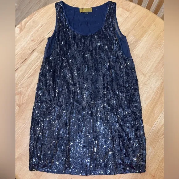 NWT Nicole Miller Sequin Shift Dress- Size: 4 Color: Blue Wide straps Sheer sides Round necklin... Show more