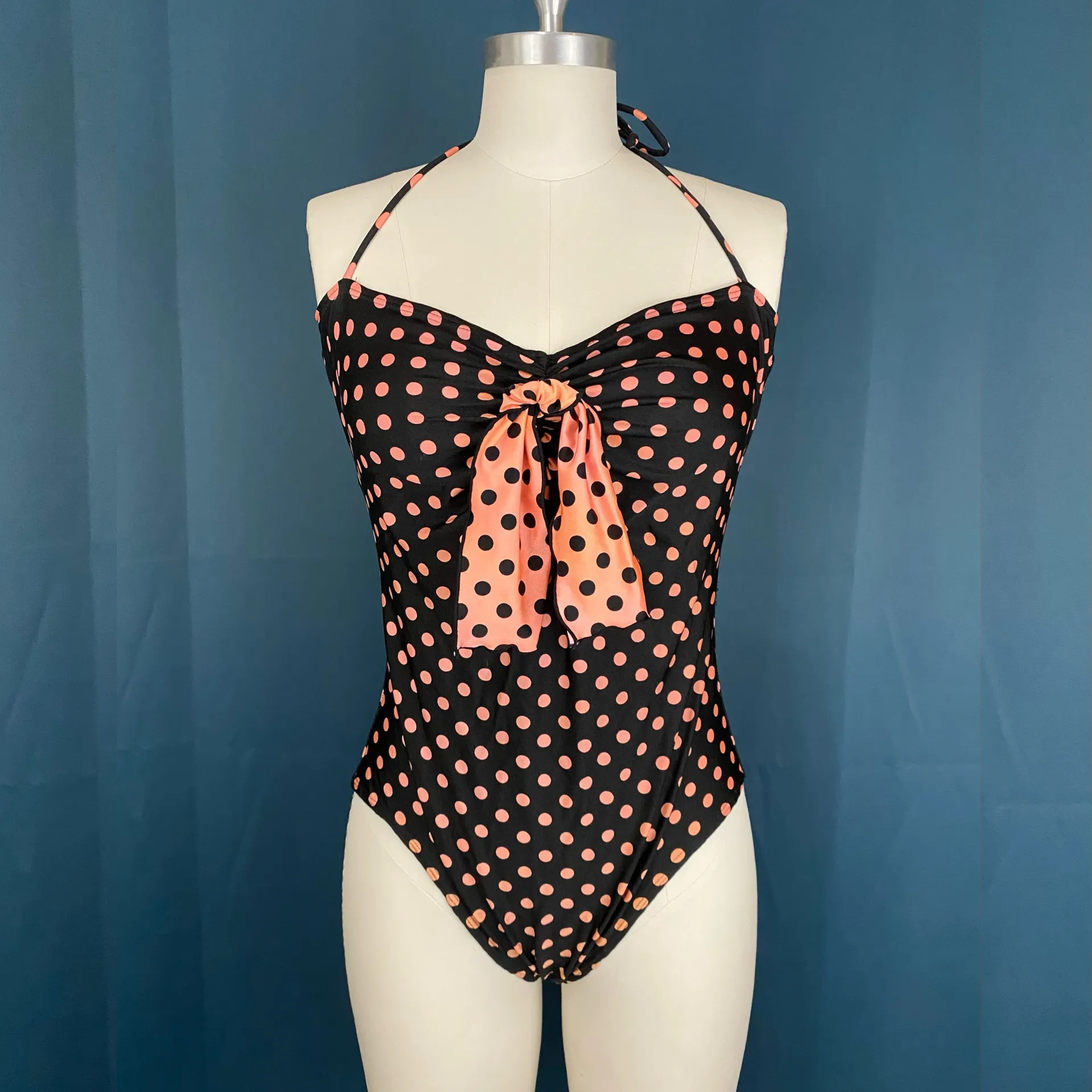1980s cutie! Halter neck ties. Boning at bust sides. Ruched bust. Elastic is dry rot at neckline and leg openings, but I just couldn’t let this get tossed! Size 14. Nylon spandex blend. Flat measurements Bust: 16” Waist: 14.5” Hips: 17” Neckline to crotch: 23”