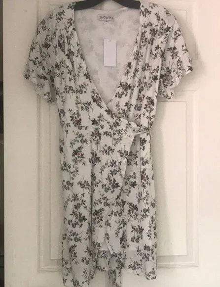 Showpo White Floral Summer Wrap Dress with ruffle sleeves Sz Small