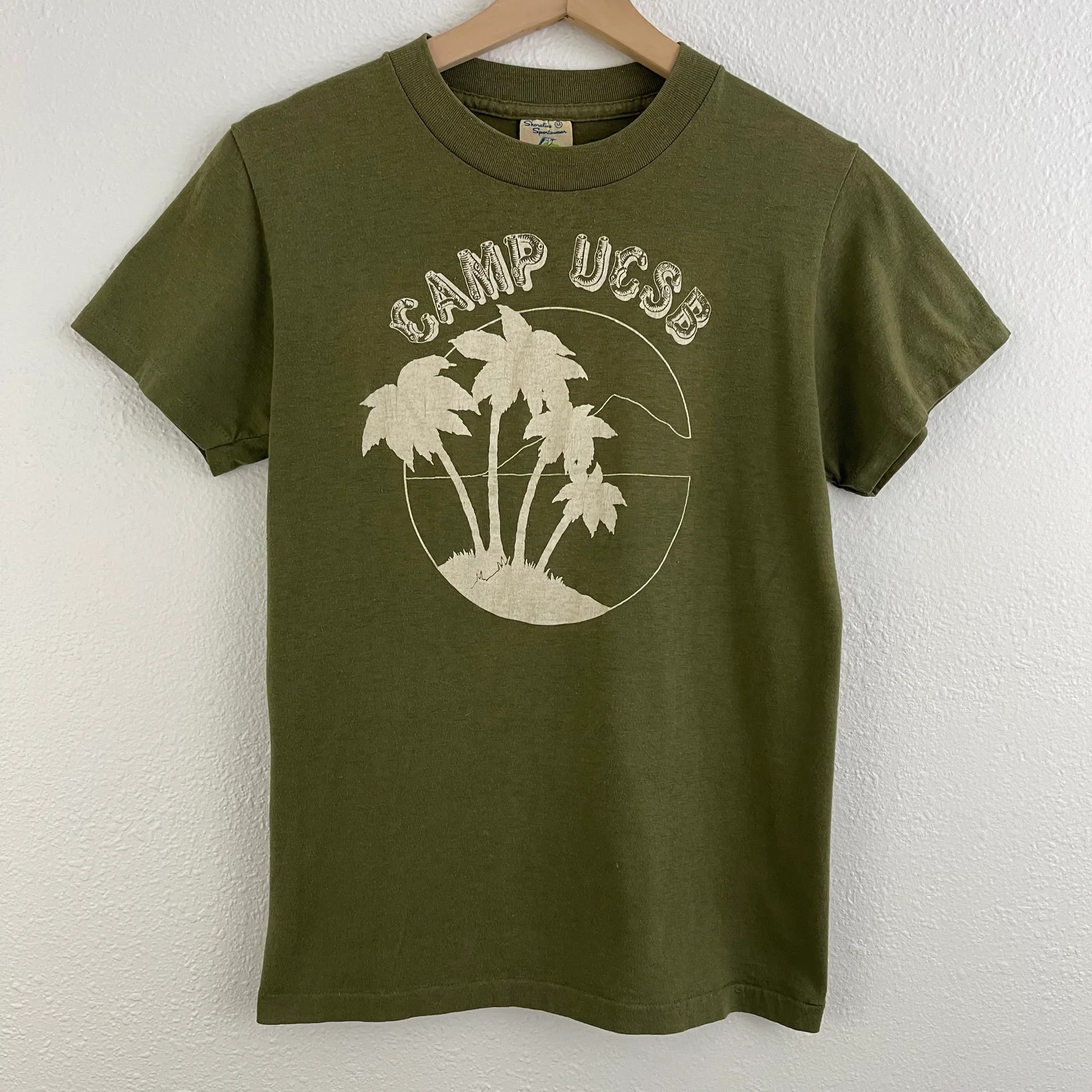 Vintage olive green Camp UCSB graphic tee by Shoreline Sportswear. In vintage condition. Has pilling. Light mark on side of graphic. Single stitch. Creasing on graphic. Made in USA. Sz M Armpit to armpit: 17.5” Length: 25” 3274-B
