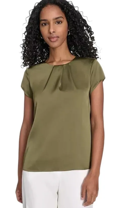 Woven Fabrication Pleated Crew Neckline Cap Sleeves Standard Fit Straight Hemline Center back Keyhol... Show more