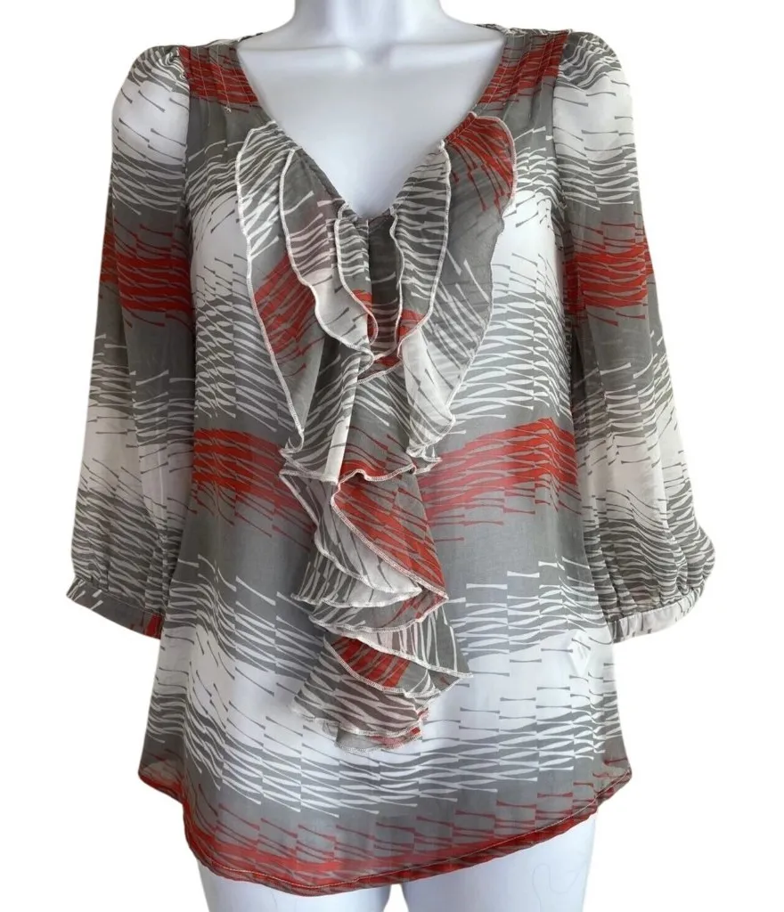 This Banana Republic blouse features a delicate sheer chiffon fabric with a vibrant striped pattern.... Show more
