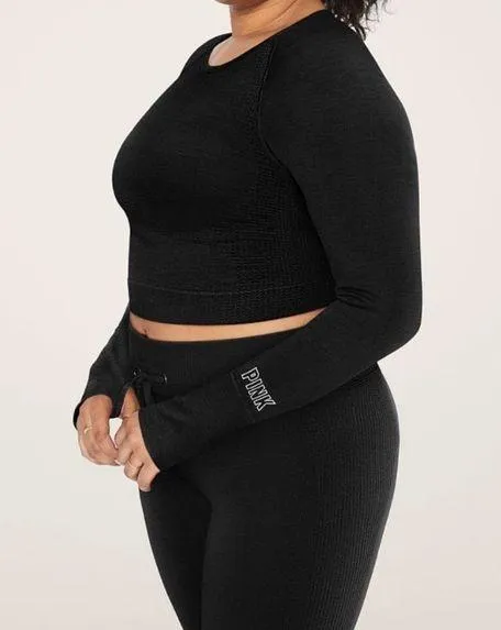 Victoria’s Secret PINK Black Seamless Thumb Holes Long Sleeve Crop Workout Top Good Used Condit... Show more