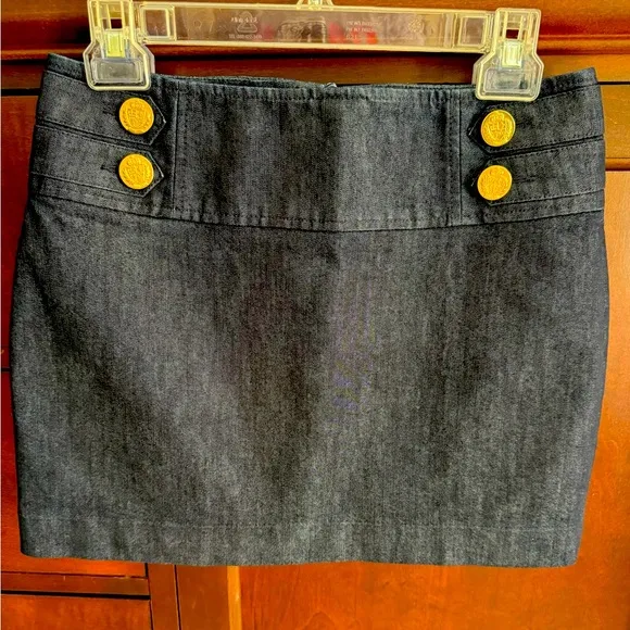 Express Denim Mini Skirt in dark wash, gold buttons accent the wide waistband, exposed back zipper,... Show more