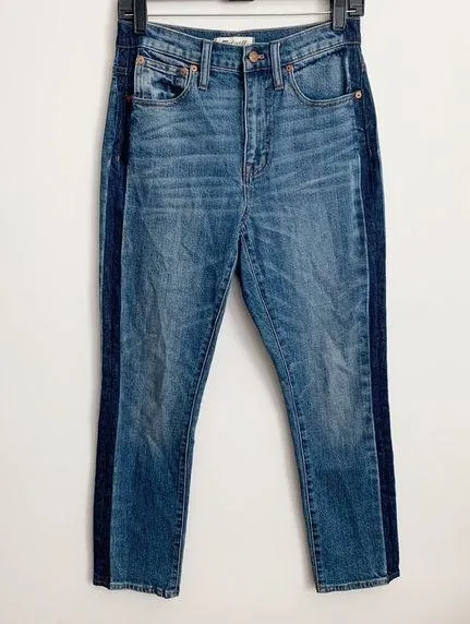 EUC Madewell The High Rise Slim Boyjean Tuxedo Strap Jeans Size 24 Medium wash denim with tuxedo st... Show more