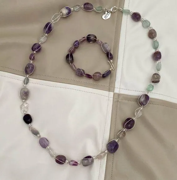 New Handcrafted Amethyst and Multi-Colored Fluorite Wire Wrapped Jewelry Set includes bracelet (approx. 7”) and necklace (approx. 22”). Semi-precious tumbled stones. Silvertone Wire. Comes with complimentary jewelry pouch. Every wire wrapped piece is unique and one of a kind. Makes a great gift. Bundle items for greater discounts. Due to the lighting item’s color may vary slightly from pictures. Thank you for checking out my listing.