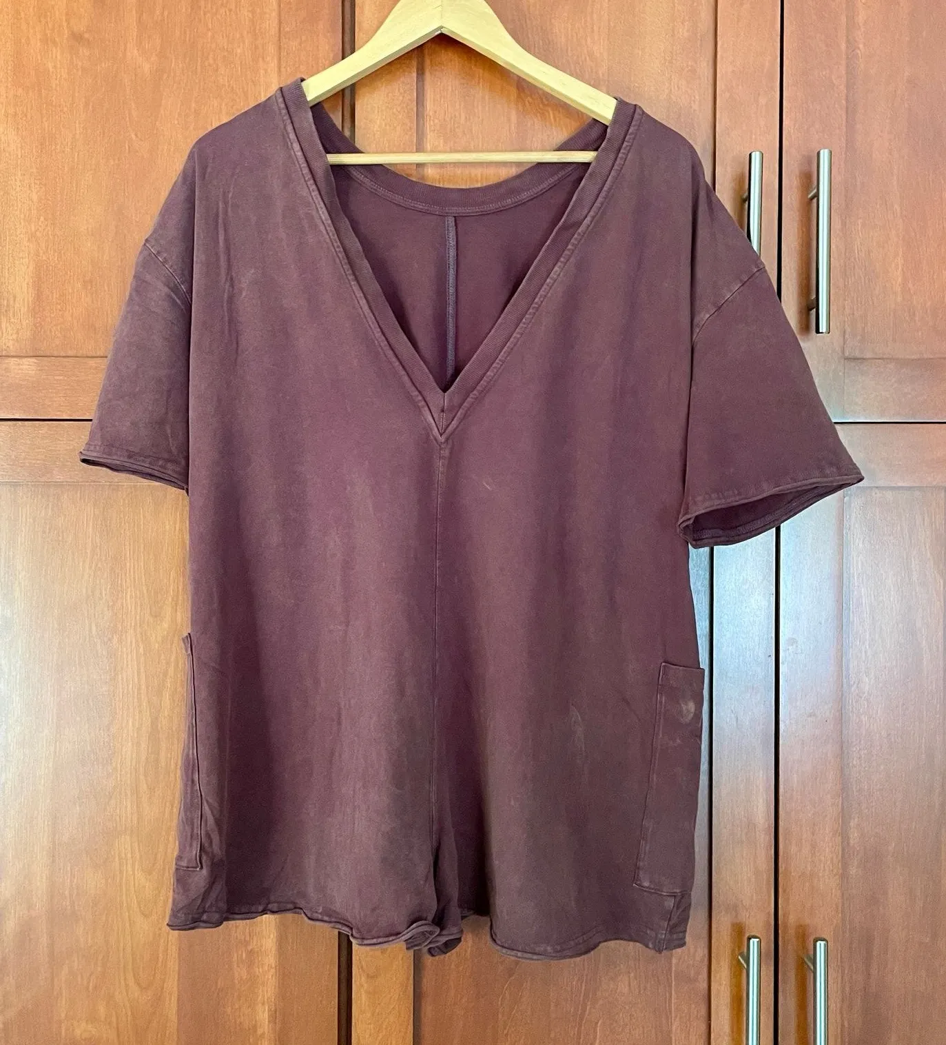 Hot Shot Tee Romper from Free People Movement. Color is brown Features soft fabric with a stretchy feel, scoop neckline, ribbed trim, patch pocket detail at front, V-shaped back, dropped sleeves, and raw hemlines. Condition: this item is new without tags, but has some lighter areas on the front and back where the dye is irregular, see pictures. Size XS Chest measures approximately 21 inches flat Inseam measures approximately 2 inches 95% cotton, 5% elastane