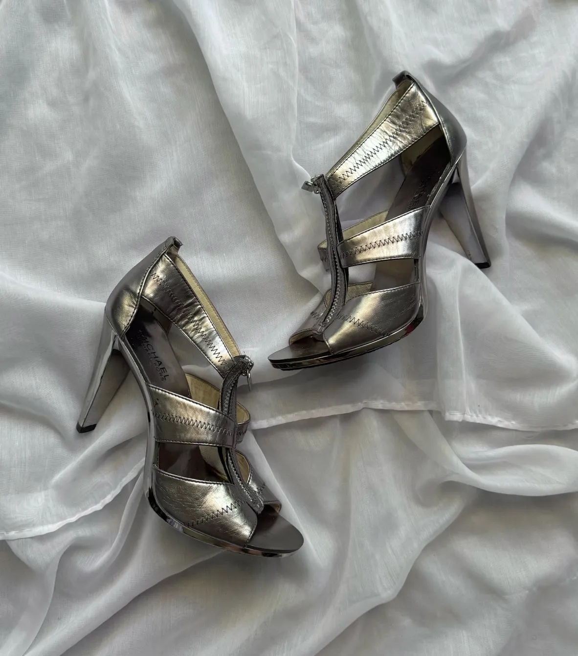 Michael by Michael Kors silver metallic patent leather heels. Sleek zipper t-strap heels with peep t... Show more