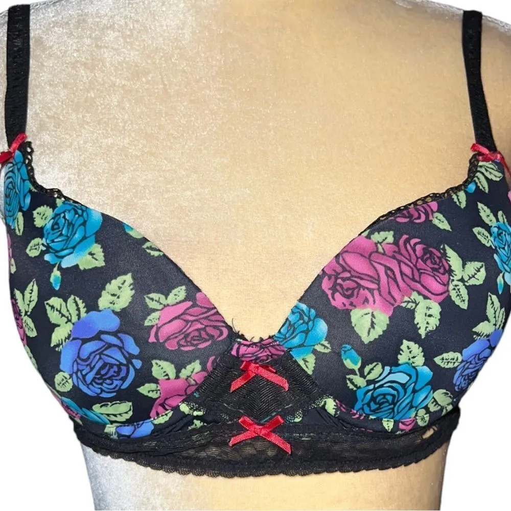 This is so cute! Black Lacey bra with pink floral design and so flirty up front with bows!