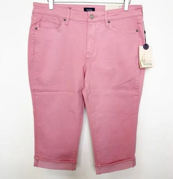 New with tags never worn NYDJ Women's Marilyn Cropped Cuff Jeans in size 12P. NYDJ, Plus Size's Marilyn jeans are crafted of stretch denim and cut in a slim-leg cropped silhouette. Rolled cuffs complete the look. Belt loops Five-pocket style Zip-fly with button closure 75% cotton/23% coolmax polyester/2% Lycra spandex Machine wash Imported Rise, about 11.5" Inseam, about 21".