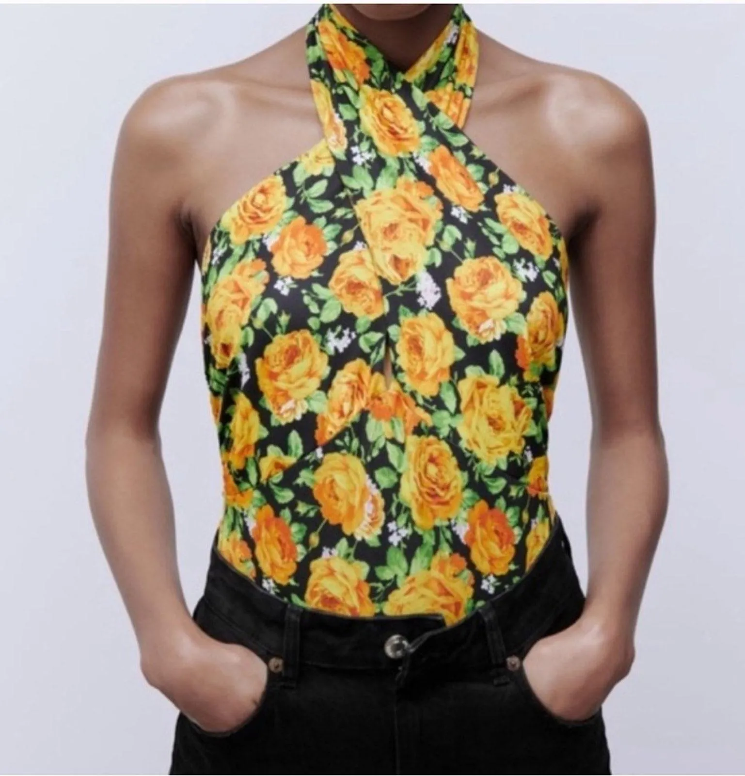 Vibrant yellow rose floral print on black background Halter neck style with self-tie closure Open ba... Show more