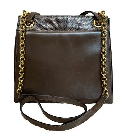 . Stunning long shoulder bag in all over smooth brown Vitello leather. Gold tone chain link with dark brown leather comfort straps. Gold tone hardware and four feet on the bottom. Spacious leather divided interior with one zippered pocket and hanging zipper charm. Comes with original purchase card. Dimensions: 10.5 x 9 x 4 inches In fair-good preowned condition. Some marks on the exterior that could be improved with good leather conditioning or a trip to the cobbler. Minor wear on the corners/edges. Minor tarnish on hardware.