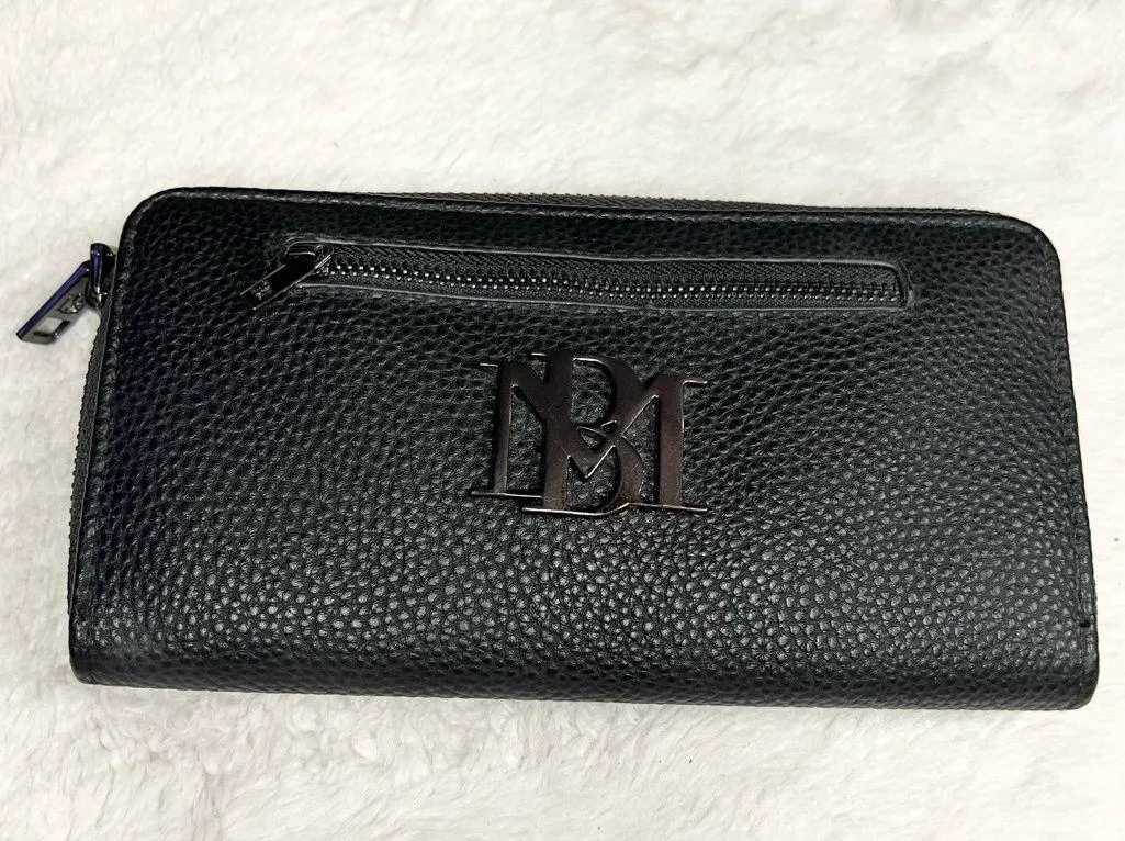 Badgley Mischka Black Textured Faux Pebble Leather Long Zip Around Wallet Stylish black textured wallet featuring a prominent logo. Includes a front zipper pocket for convenience.