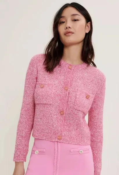 Size 1 = US small *small mark on back of neck- see last photo Cropped, straight-cut cardigan. Decorative knit with shiny finish. Long, straight sleeves. Round neckline and two-tone lacquered metal buttons. Two patch pockets on chest. Ref: MFPCA00272 Ref: MFPCA00272 Main material: 47% polyester, 25% wool, 20% polyamide, 8% mohair Hand wash Do not bleach Iron at a maximum temperature of 110°C without steam Professional dry cleaning in PC and HC, mild process Do not tumble dry Product code: MFPCA00272
