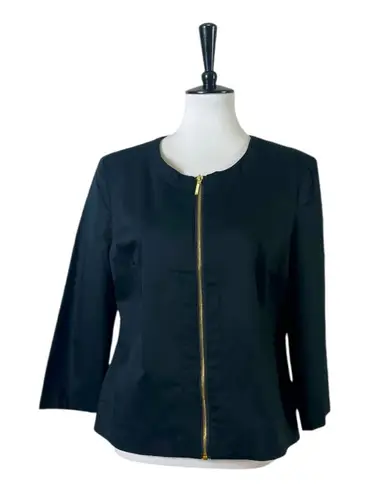 Style Details • Collarless blazer/jacket • Gold zip front • 3/4 sleeves • Solid black • Cotton & sp... Show more