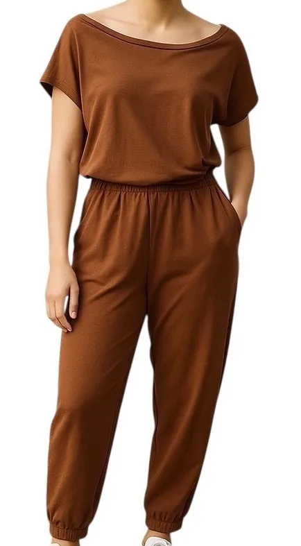 Anga Fashion Women's Short Sleeve Ankle Tapered Leg Jumpsuit Brown Size Small Short sleeve Keyhole back with button closure Pullover styling Tapered leg Pockets Cotton blend Machine wash A modern one-and-done piece with clean lines and a flattering, tapered shape.