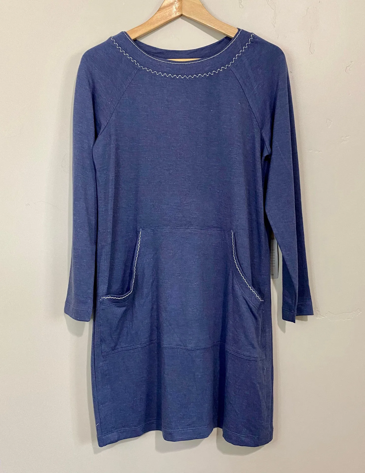 Max Studio Women’s Long Sleeve Midi Casual Dress Front pocket Blue and white detail stitching Deni... Show more