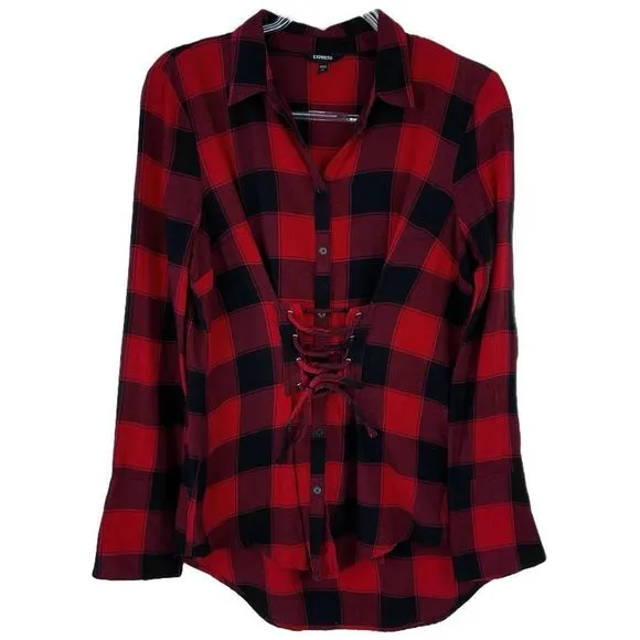 Express Red Black Plaid Corset Front Button Up Tunic Shirt Small This shirt is in good condition R... Show more