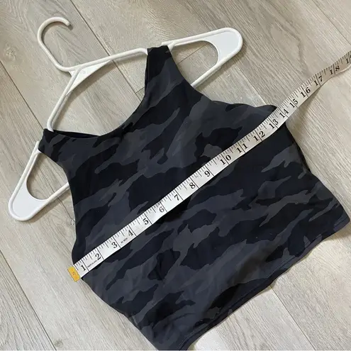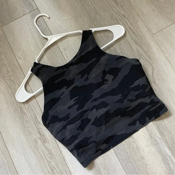 Athleta Conscious Camo Crop Top in the color Black and Gray. High neckline. Sleeveless. Crop length.... Show more