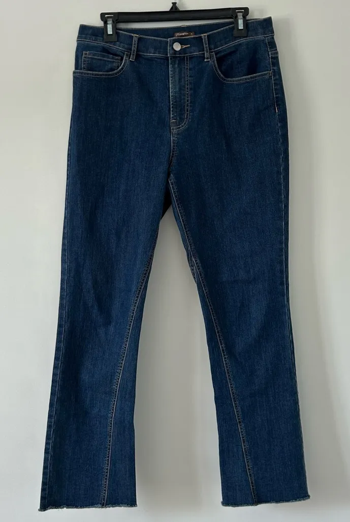 J. McLaughlin Dark Wash Boot Cut High Rise Raw Hem Size 8 High rise Dark Wash denim with stretch... Show more