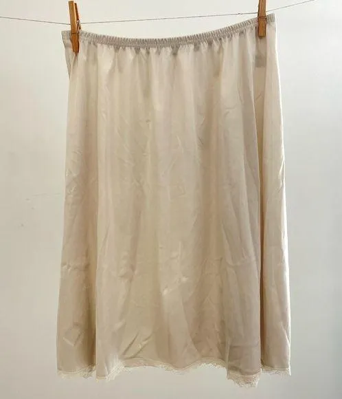 In great condition! 20 inches long. Elastic is still stretchy and in good condition. Simple lace detailing on the hem. Nylon material. Size M. #19 #vintage #slipskirt #cream #coquette #retro