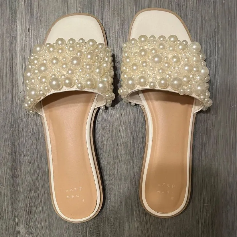 These cream sandals from A New Day feature a wide band adorned with pearl-like beads, offering a chi... Show more