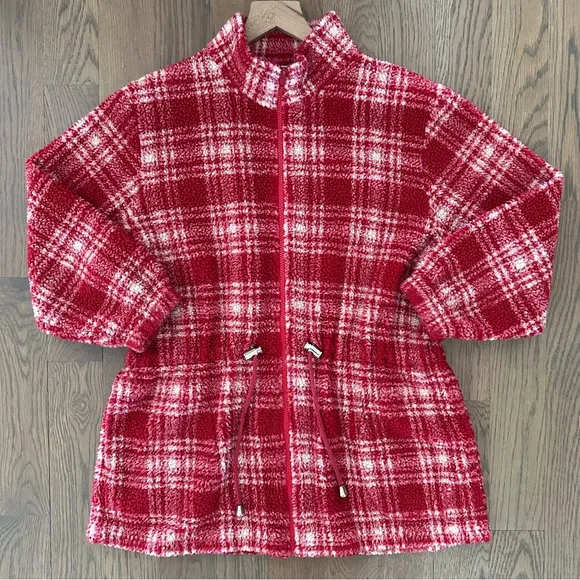 Anthropologie vintage collared drawstring waist jacket. In red and white plaid. Zip front, long slee... Show more