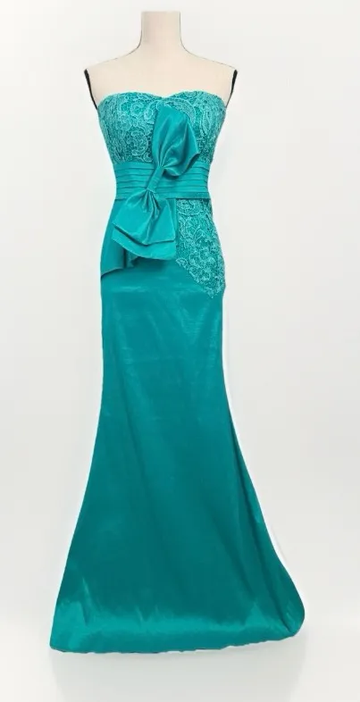 • Style and Silhouette: Mermaid gown, trumpet dress, strapless, sweetheart neckline, corset, bodycon. • Fabric and Details: Satin, silky, lace appliqué, rouched, bow •Color: Teal, peacock blue, aqua green. • Occasion: Prom dress, evening gown, formal dress, cocktail party dress, wedding guest dress, homecoming Only Worn Once Excellent Preloved Condition No rips, stains, or tears noted Stored in a pet friendly smoke free home Measurements are approximate while laying flat in photos #hoco #sirencore #ethereal #mermaid #Y2K